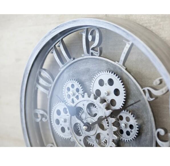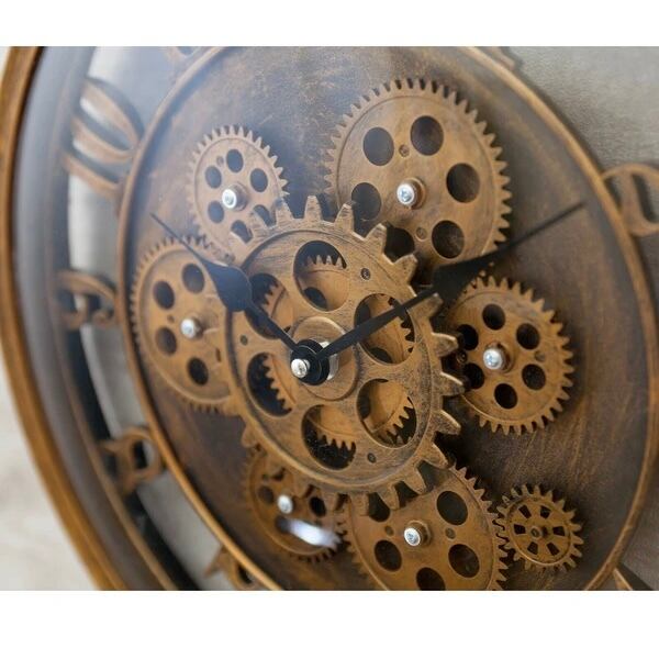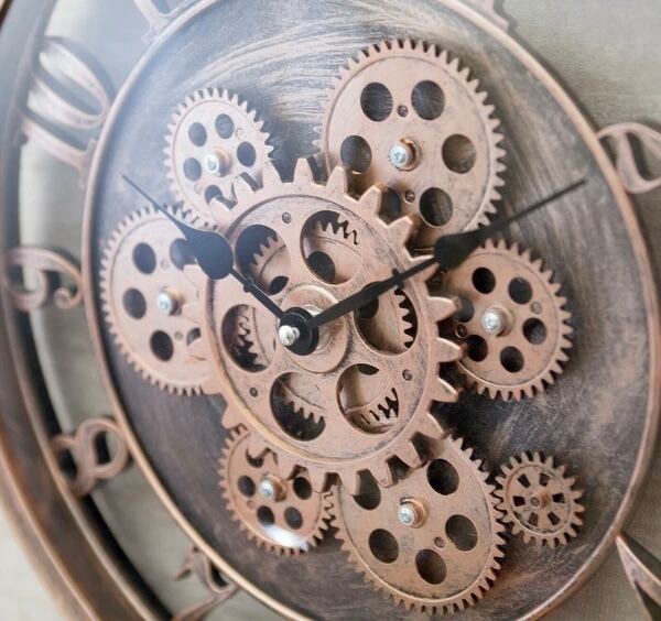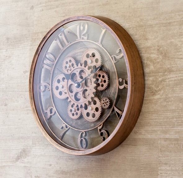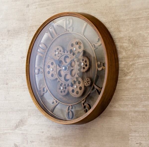 大胆に露出したギアが、空間にインダストリアルな美しさを添える壁掛け時計。