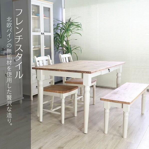定番のホワイトは、ナチュラル色のパイン無垢材と合わせることで、あたたかみのある優しい雰囲気のフレンチダイニングを演出してくれます。