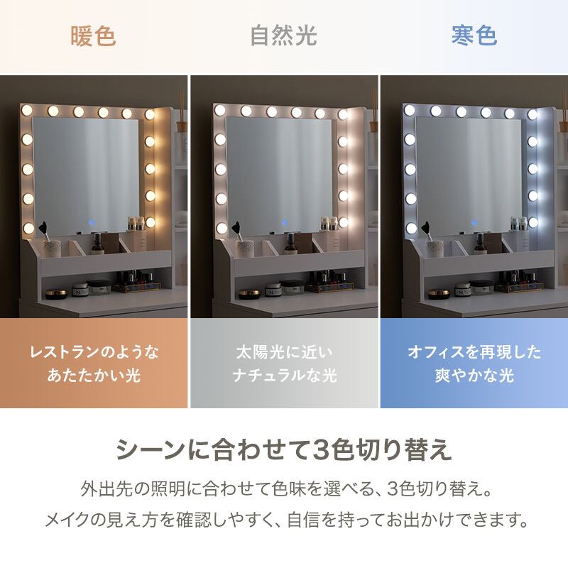 LEDの女優ライト付きの大きなミラーで顔全体が見やすいドレッサー。