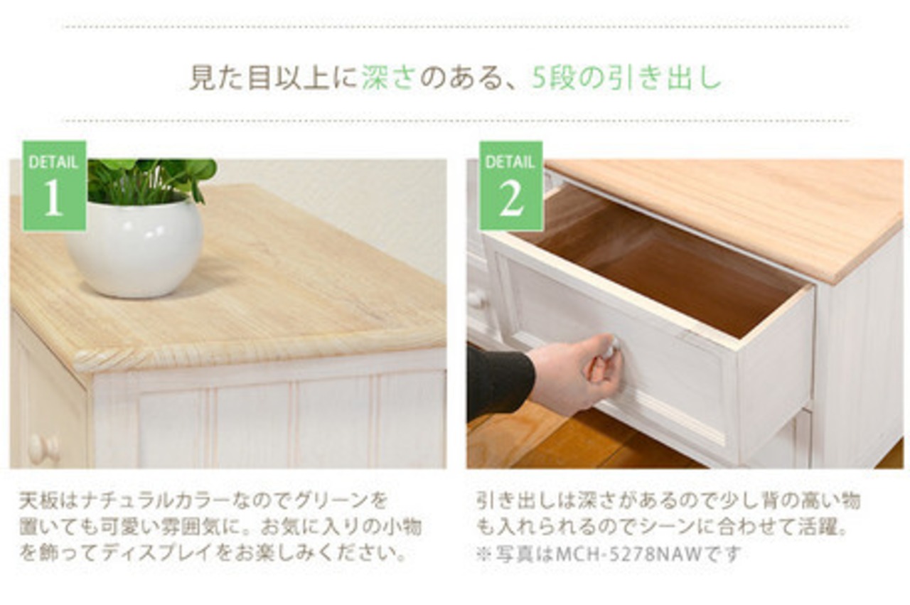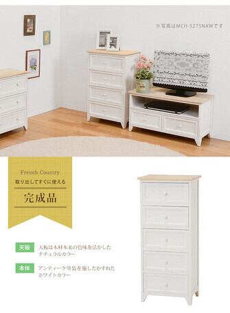 シャビーホワイトの本体にアンティーク調ナチュラルな天板が映える、シンプルチェスト。