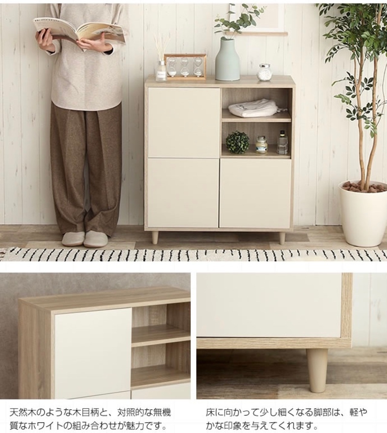 シンプルなデザインでありながら、天然木のような木目柄とホワイトの組み合わせが、ナチュラルでありながらモダンな印象を与えてくれます。コンパクトながら収納力抜群で、置く場所を選ばず、リビングやキッチン、デスク周りなど、いろいろなシーンで活躍してくれます。1人暮らしの方や、ワンルームにお住いの方におススメです!