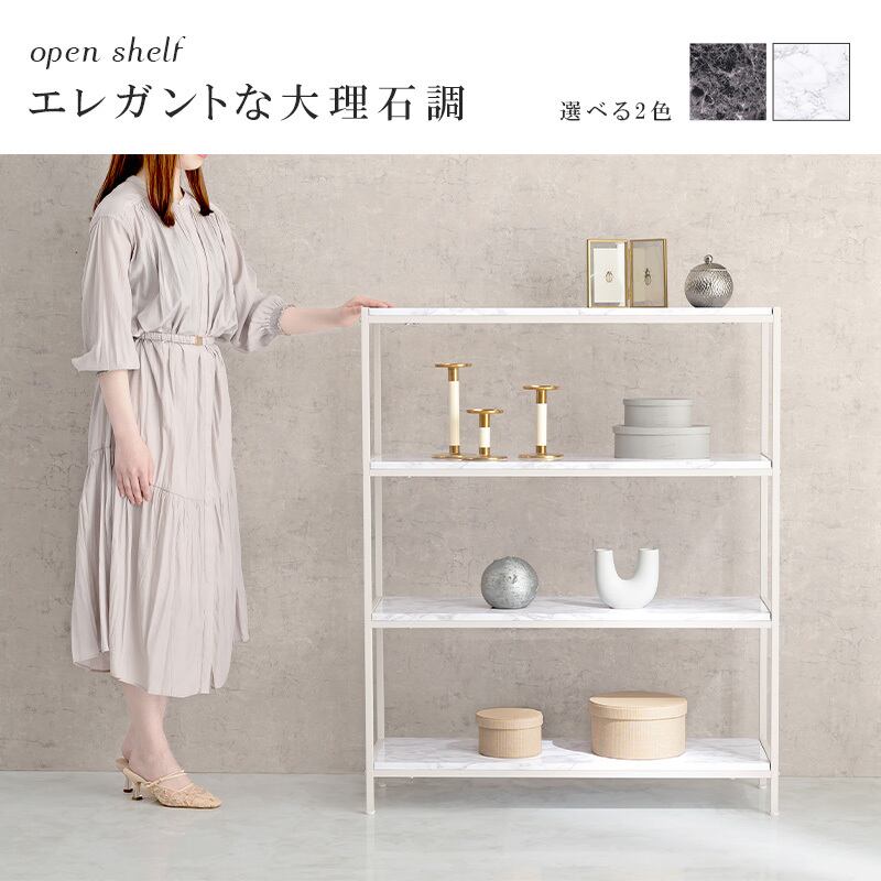 モノトーンで気品のある大理石柄のオープンラック。ほどよくツヤもあり高級感を醸し出します。