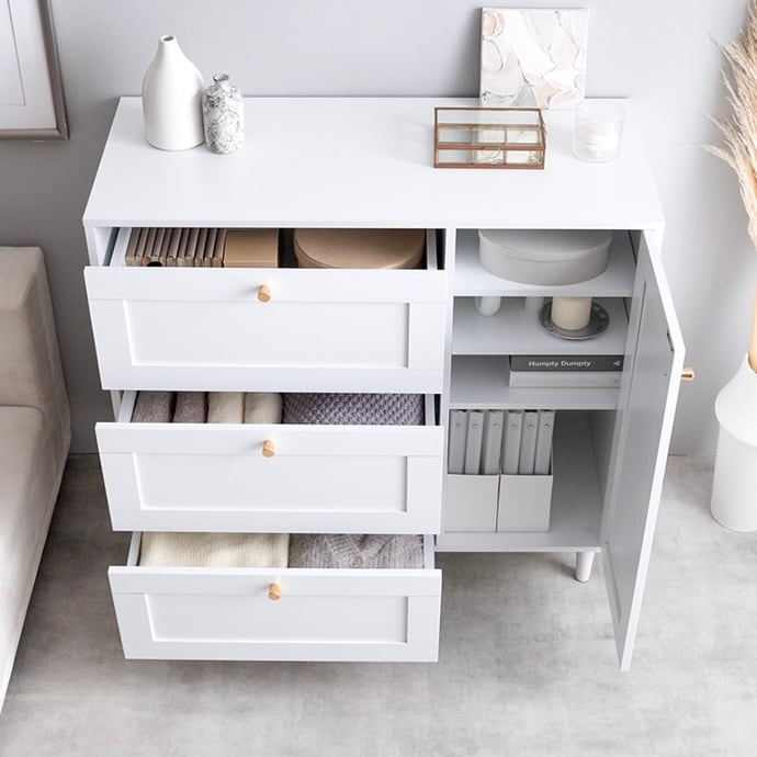 品のある框(かまち)デザインと柔らかなニュアンスカラーが印象的な『Calan(カラン)』シリーズのキャビネット。
