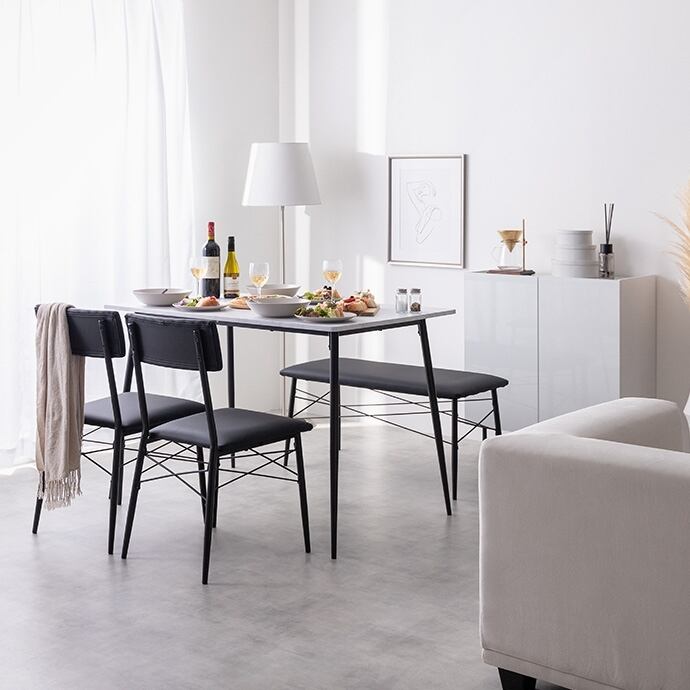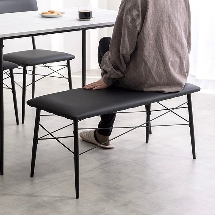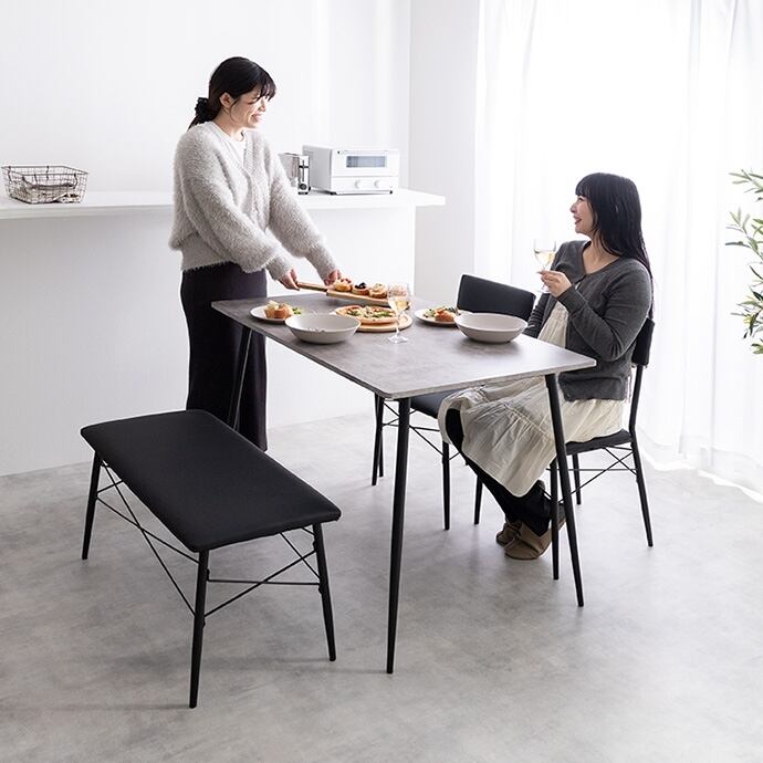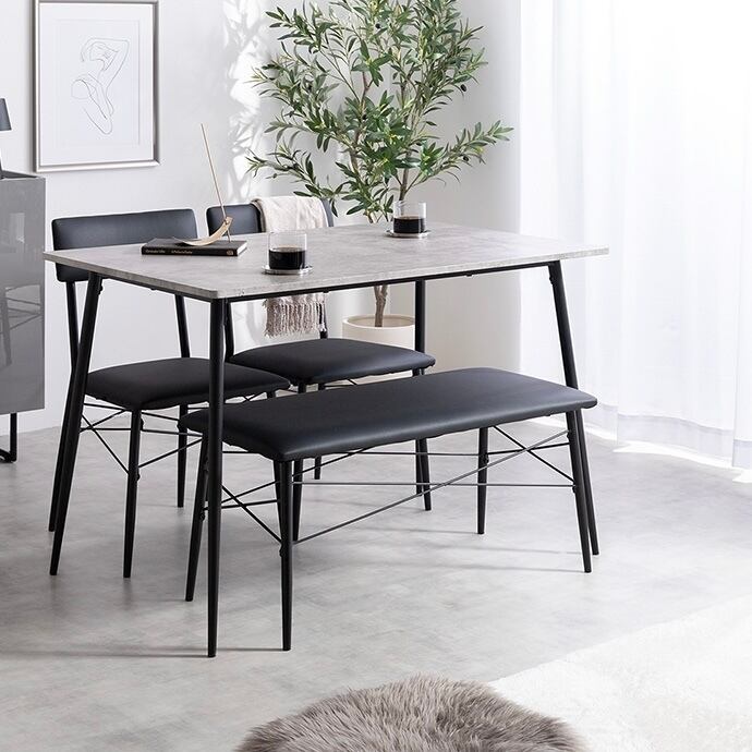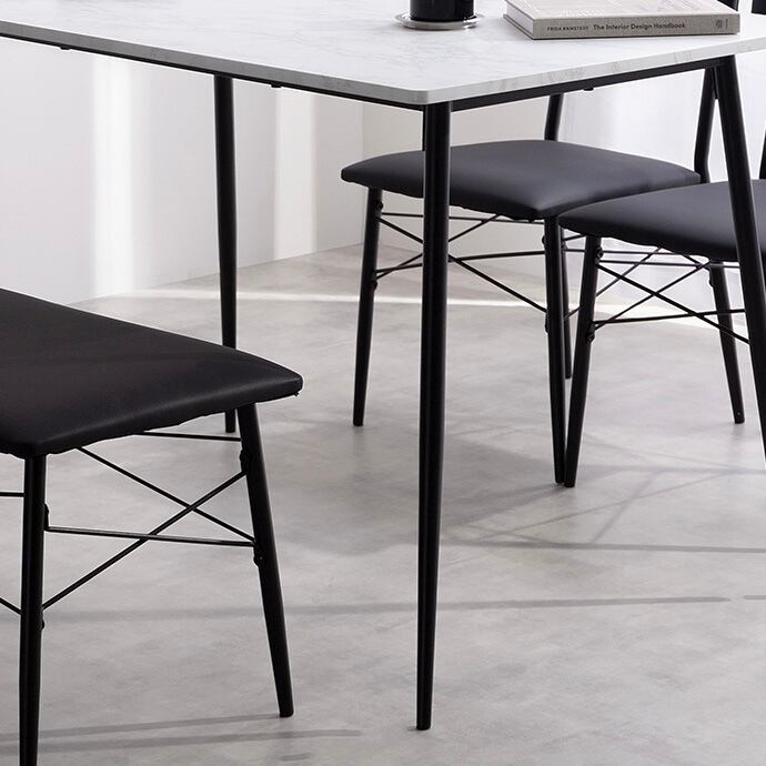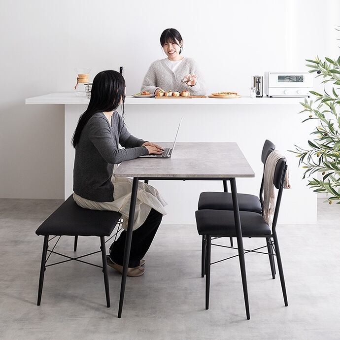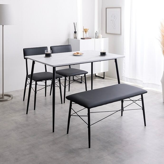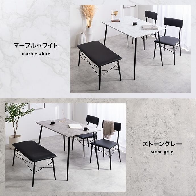 滑らかな石目柄を使用しているので、お部屋にスッと馴染み上品な空間を演出します。またチェアとベンチにはもっちり座り心地のいいクッションを使用。