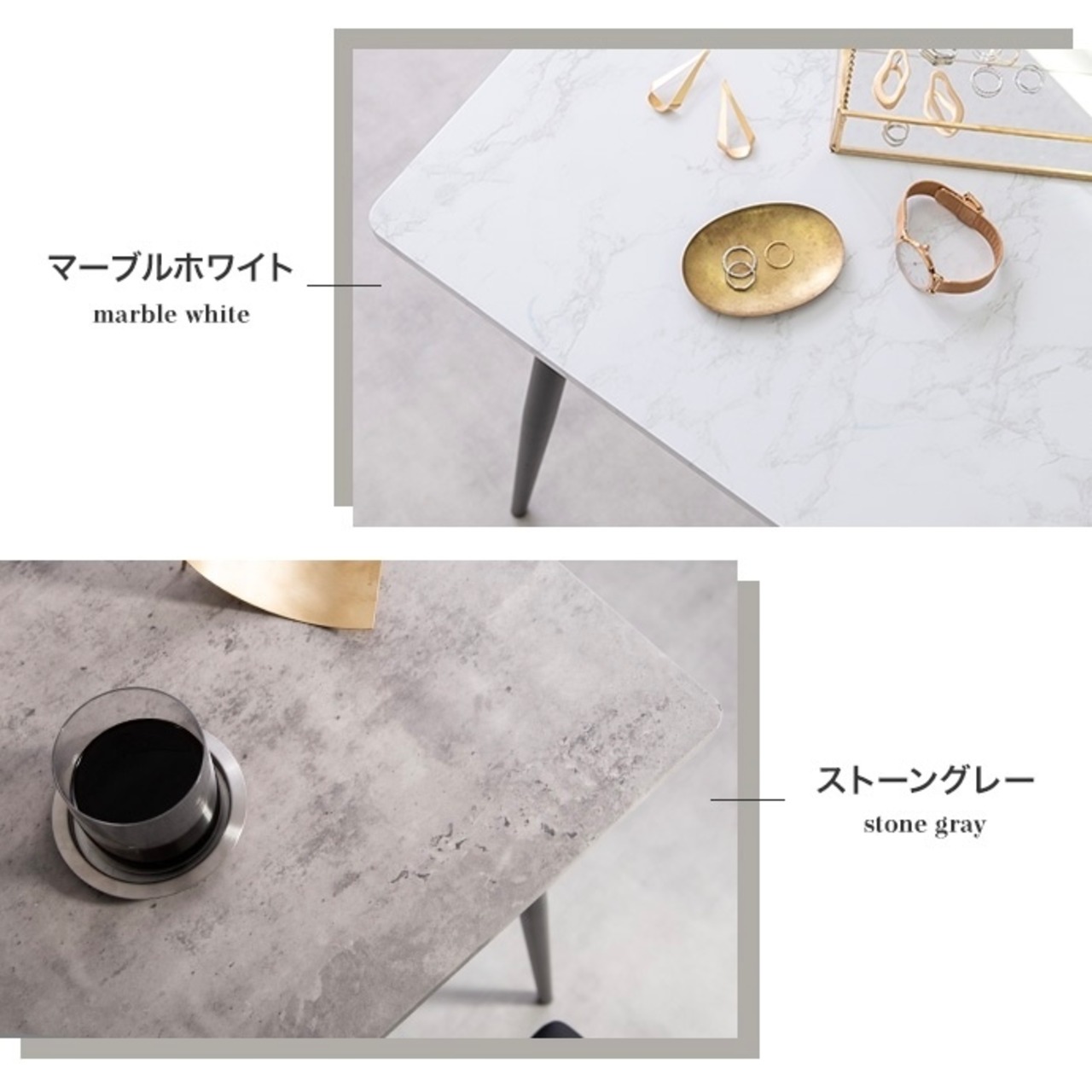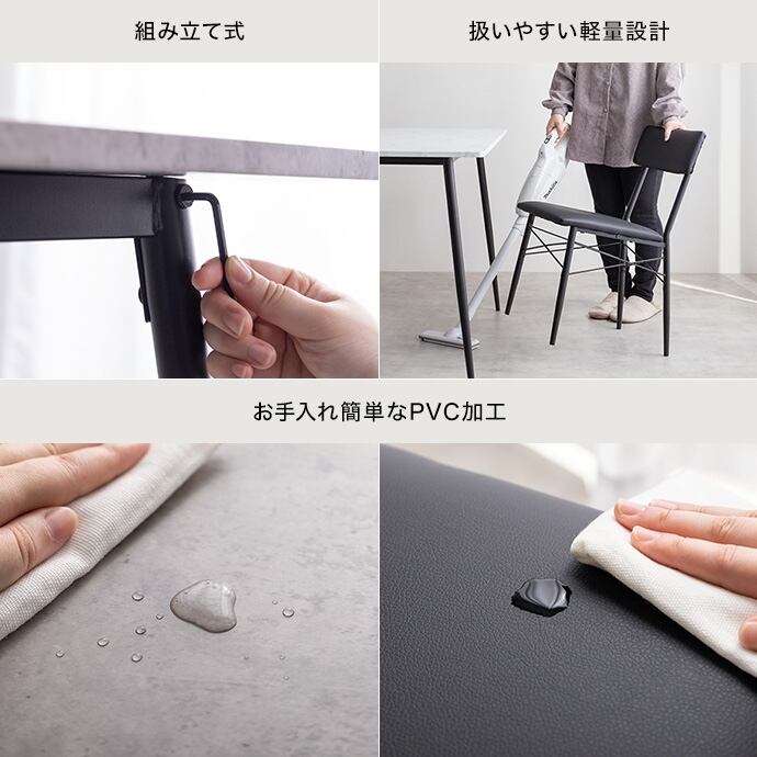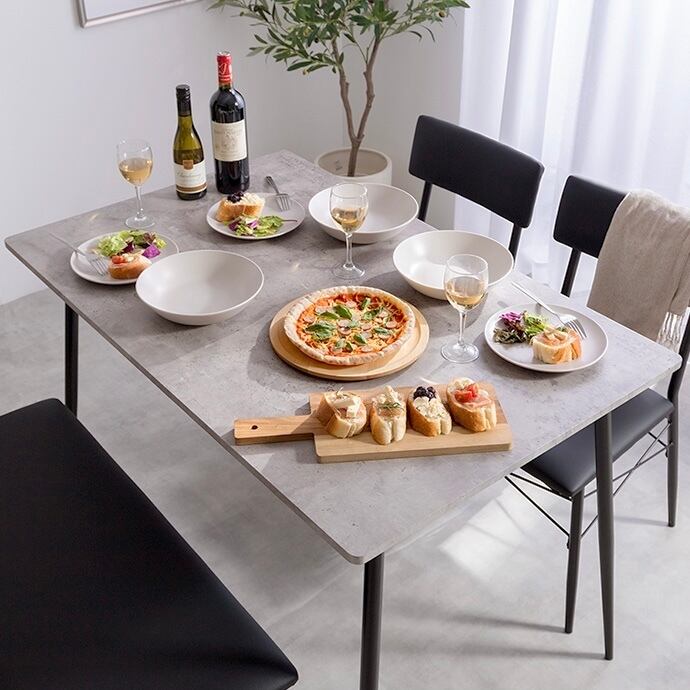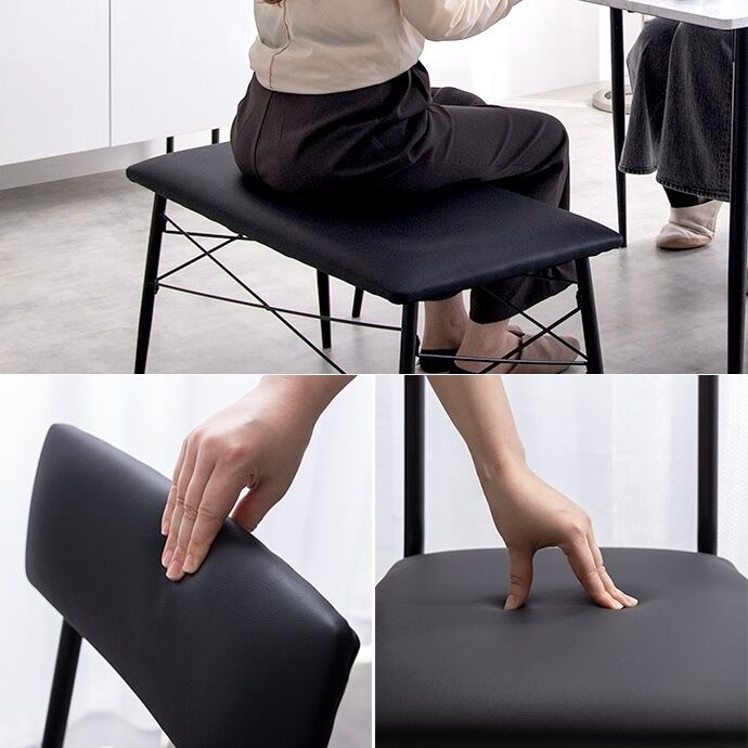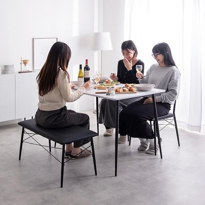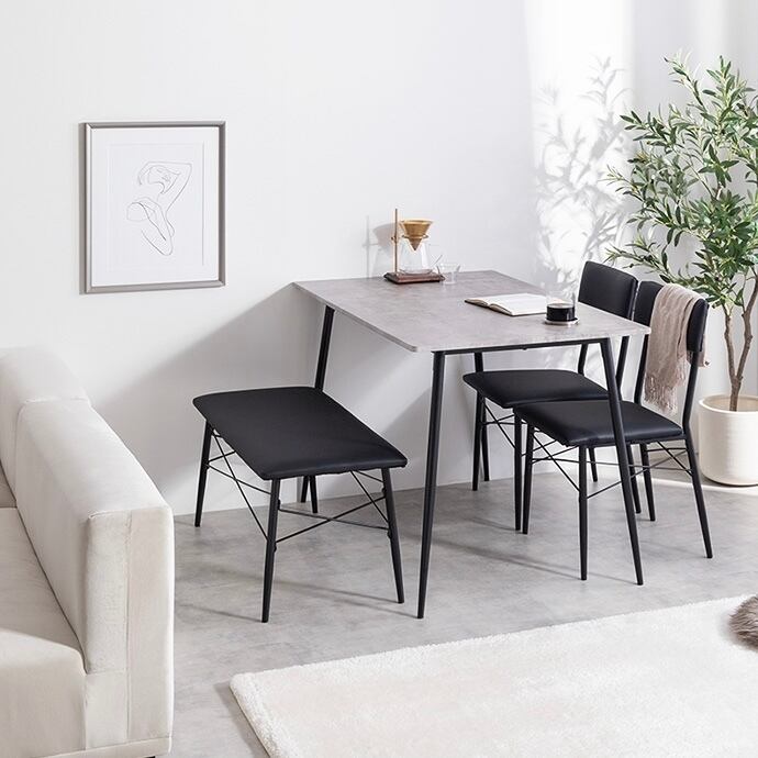 滑らかな石目柄を使用しているので、お部屋にスッと馴染み上品な空間を演出します。またチェアとベンチにはもっちり座り心地のいいクッションを使用。