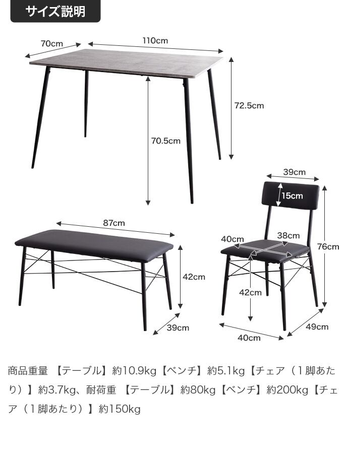 【商品重量】テーブル:約10.9kg、ベンチ:約5.1kg、チェア:約3.7kg